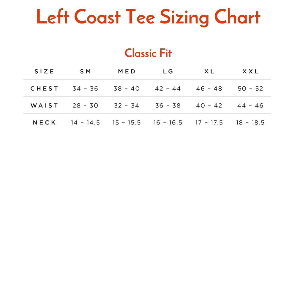 Left Coast Tee's timeless Modern American Fit features straight-cut side seams, a higher neckline, wider shoulders and sleeves, and a slightly longer length than their Shaped Fit. See photos for the Fit Guide.