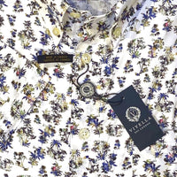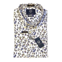 Blue, green, and white island palm print sport shirt crafted from Viyella's cotton fabric, with just a hint of stretch added from comfort.