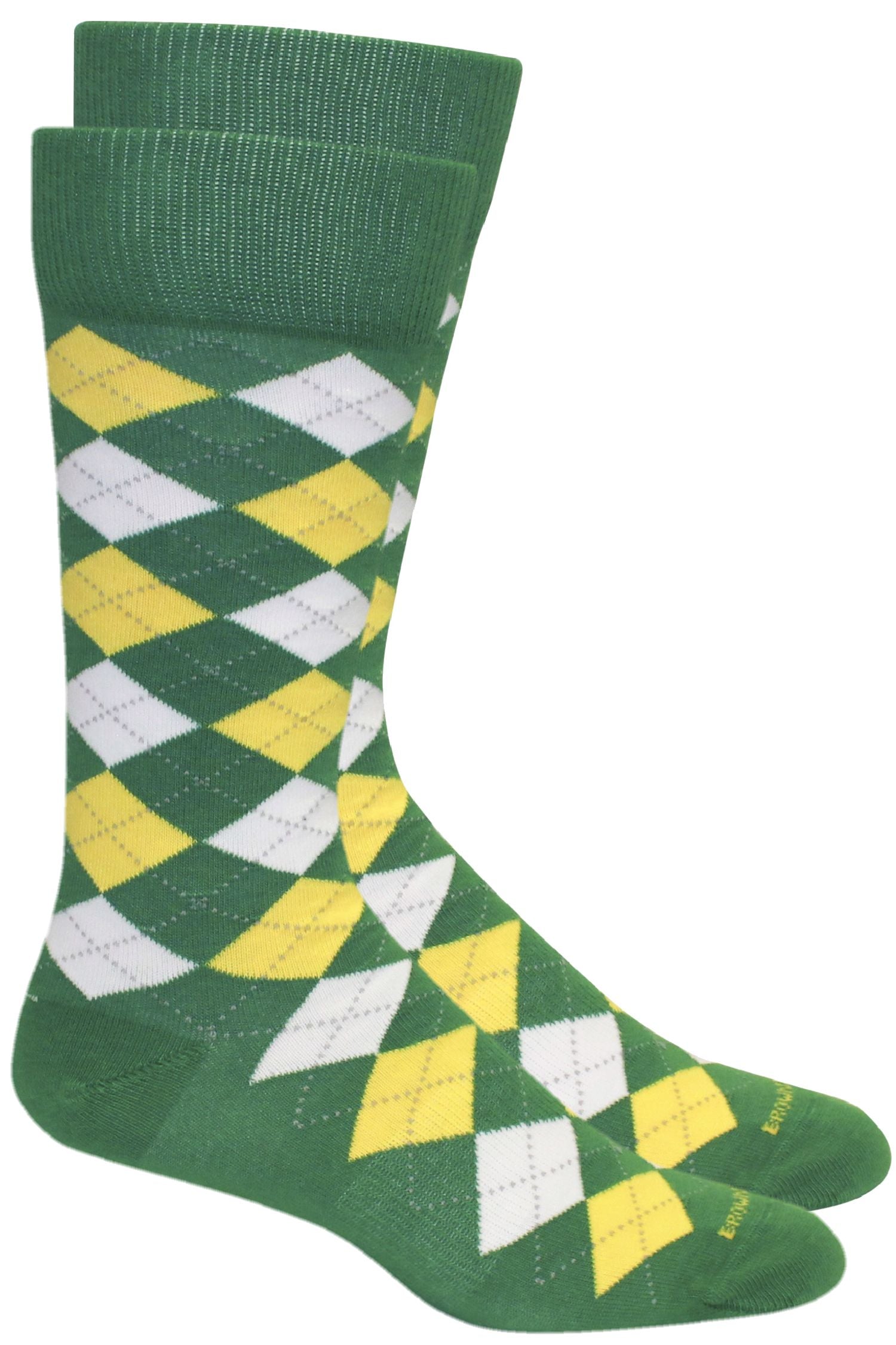 Support your team with Brown Dog's argyle cotton cotton blend socks in jolly green, yellow and white.