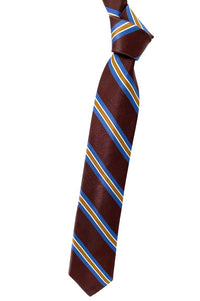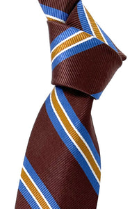 Robert Talbott woven silk faille tie in a brown, blue, gold, and white stripe.