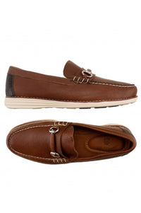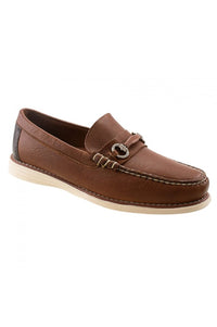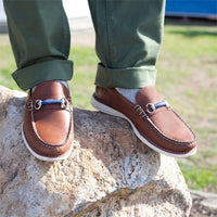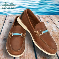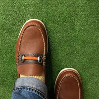 Easily personalize your shoe with T.B. Phelps' patented interchangeable Bridge Bits® system! The Freeport hybrid loafer in Gridiron brown tumbled calfskin leather comes with nickel finished leather wrapped horse bit ornaments. Handsewn upper with contrast stitching creates a refined look that has the ability to be either casual or formal. Traditions genuine rubber cupped outsole.