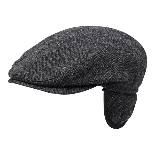 Ivy Slim cap with earflaps in 100% Shetland wool from Morgado with a classic herringbone pattern.